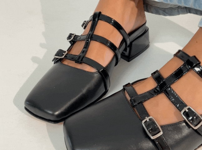 Diseño elegante y funcional: cuero negro liso con tiras en charol regulables para un calce seguro y adaptable.