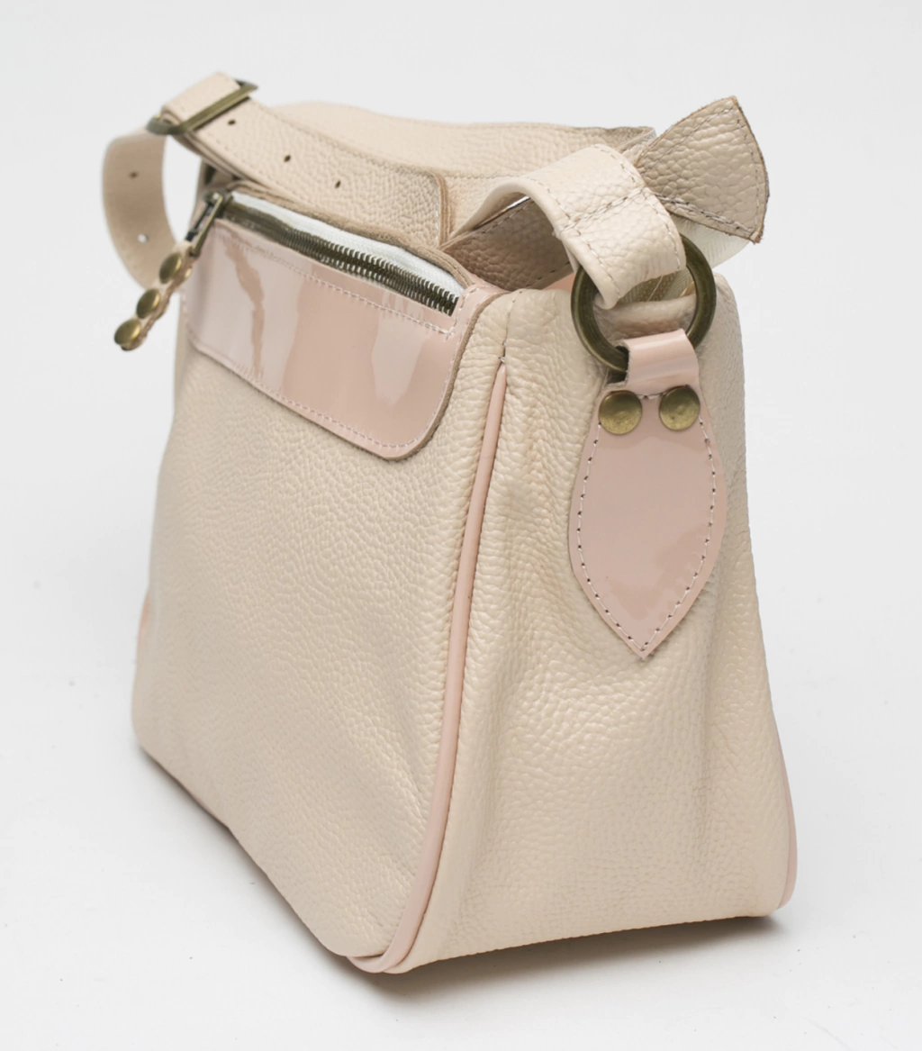 Realizada en cuero legítimo grano, varios compartimentos con detalles charolados y cierres externos metalizados