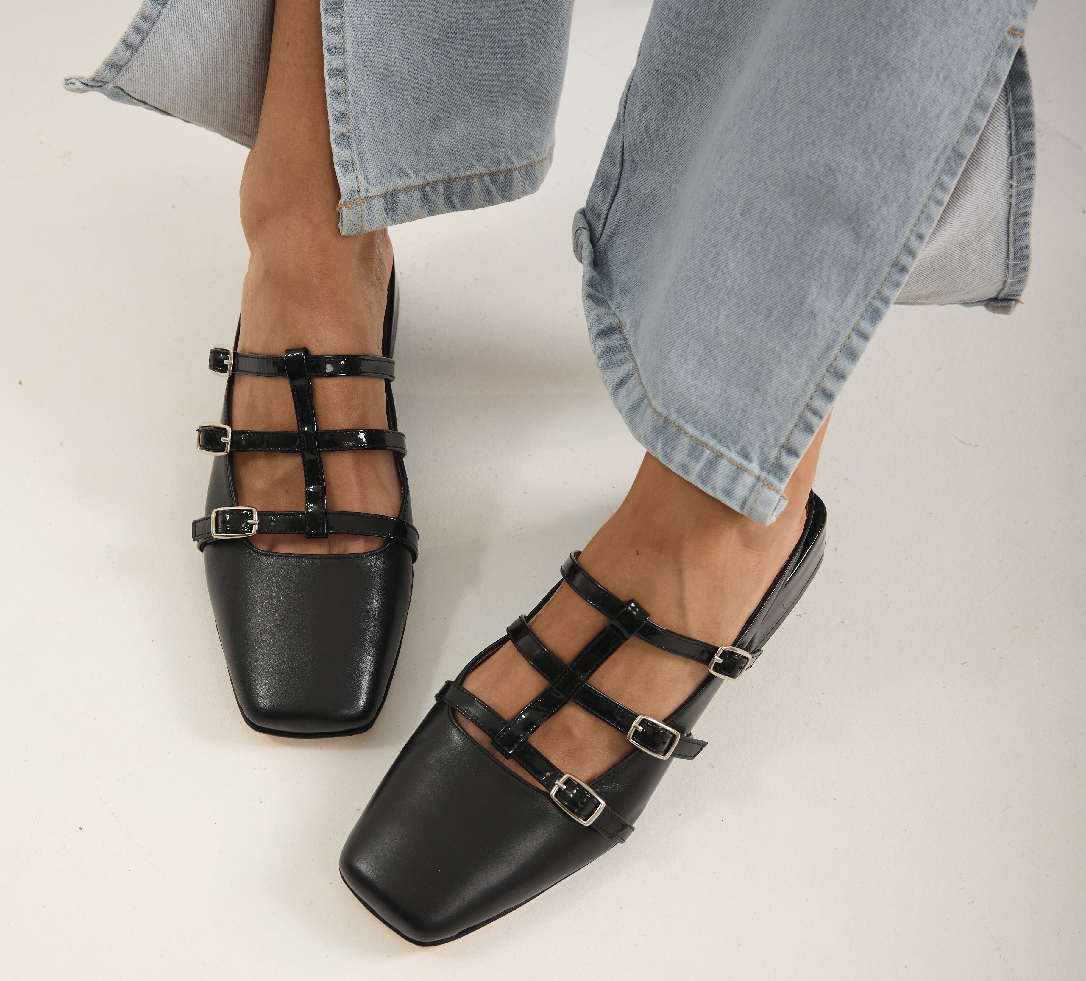 Las Balerinas Jime fueron diseñadas para acompañarte todos los días con comodidad real, estilo y un diseño distintivo. Confeccionadas en cuero negro liso y terminadas con tiras regulables en charol, combinan versatilidad, elegancia y un calce pensado para jornadas largas.